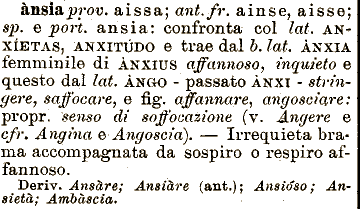 Deriv. Ansare; Ansiàré (ant.) ; Ansioso ; Ansietà; Ambascia. ANXITÙDO e trae dal b. lat. ÀNXIA femminile di ÀNXIUS affannoso, inquieto e questo dal lat. ÀNGO - passato ÀNXI - stringe.re, soffocare^ e fig'. affannare^ angosciare: propr. senso ànsia provi. a issa; ant.fr. ainse, a isso; sp. e port. ansia: confronta col lai. ANXIETAS, di soffocazione (v. Angere e cfr. Angina eAngoscia). — Irrequieta brama accompagnata da sospiro o respiro affannoso.