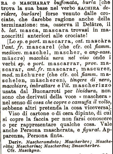 viso onde i verbi Bp. e pori. mascarrar, dalle crociate, che darebbe ragione anche della terminazione: ma, osserva il Delātre, il b. laiģ mas e a, mascara trovasi in manoscritti anteriori alle crociate! prov. mascarar, ant.fr. mascarar, mascurer, mod. māchurer (che cfr. col fiamm. maschelen, RA o MASOHARAT buffonata, usata dal Buonarroti per lividura., non sono che derivati della voce Ģ maschera ģ nel senso di cosa che copre o camujf'a il volto, sebbene altri pretenda la cosa viceversa]. Viso di cartone o di cera dipinto, di cui si copre la faccia per non farsi conoscere o per rappresentare qualche cosa. Vale anche Persona [Lo sp.eport. mascarra, cai. mascāra Vani. fr. mascarel (che cfr. col fiamm. medioev. maschel, mascher, e ang-sass, m a sere) macchia nera nel burla [che trova la sua base nel verbo SACHIRA deridere, burlare] forse venuto māscheren), tingere di nero, macchiare, imbrattare e Vii. mascherizzo mascherata, e figurai. Apparenza, Persona finta. Deriv. Maacheraménto} Mascherare ; Mascherata; Mascherino; Mascherane; Smascherare. Ofr. Mascagno.