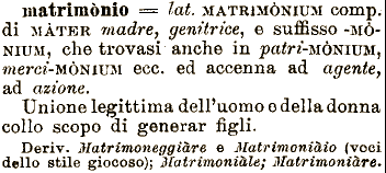 generar figli. Deriv. Matrimoneg giare e Matrimoniàio (voci dello stile giocoso); comp. di MÀTER madre, genitrice^ e suffisso -MÒNIUM, che trovasi anche in ^a^rz'-MÒNiUM, wercz-MÒNiUM ecc. ed accenna ad agente, ad azione. Unione legittima delPaomo o della matrimònio == lat. MATRIMÒNIUM donna collo scopo di Matrimoniale; Matrimoniare»