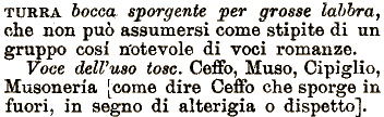 sporgente per grosse labbra, che non può assumersi come stipite di un gruppo cosi n'otevole di voci romanze. VOGO delVuso tose. Ceffo, Muso, Cipiglio, Musonerta [come dire Ceffo che sporge in fuori, in segno di TURRA bocca, alterigia o dispetto].