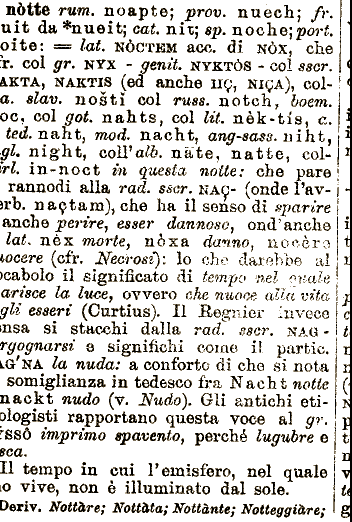 al gr. rssò imprimo spavento, perché lugubre e sca. Il tempo ond5 anche lai. nèx morte, nòxa danno, nocère tacere (cfr. .Necrosi): lo che darebbe L&'NA la nuda: a conforto di che si nota somiglianzà in tedesco fra Nachfc notte nackt nudo (v. Nudo). Gli antichi etiologisti rapportano questa voce nòtte cs. ted. naht, mod. nacht, ang-sass. iiiht, .gì. night, colP ^6. nate, natte) colvrl. in-noci in questa notte: che pare rannodi alla rad. sser, NA^- (onde Pavsrb. na9tam),che rum. noapte; prov. nuéch; /r. uit da ^ueit; cai. niv, sp. noche;por. o i tè: *== 7a. NÒOTBM acc. di NÒX, che T. col ^rr. NYX - genit. NYKTÓS - col ^ffcr. AKTA, NAKTIS (ed anche 119, NI(?A), cola. a?av. nostì col russ. notch, boem, oc, col got. nahts, col Ut, nèk-tis, al cabolo il significato la luce, ovvero che nuoce alla vita gli esseri (Curtius). Il .Regnier invece »nsa si stacchi dalla rad, sscr. NAGrgognarsi e significhi come il parfcic. in cui P emisfero, nel quale io vive, non è illuminato dal sole. Deriv. Nottàre; ha il senso di sparire anche perire, esser dannoso, di tempo nel quale arisce Nottata; Nottante; Notteggiàre;