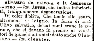 salvatico, de'cui rami olivastro da OLÌVO-A e la desinenza -ASTRO scuro, altrimenti Olivigno. In forza di aost, Ulivo ===' lai. ASTBR, che indica inferiorità, tralignamento, degenerazione. Di coler declivo, Ohe tende allo erano le corone, che si davano in premio ai vincitori de'giuochi olimpici : detto anche 01 e a" stro == lai. ole as ter.