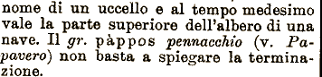 uccello e al tempo medesimo vale la parte superiore dell'albero di nome di un una nave. Il gr. pàppos pennacohio (v. Papavero) non basta a spiegare la terminazione.