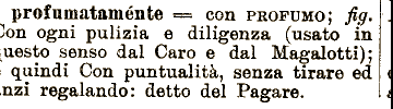 e diligenza (usato in [uesto senso dal Caro profumatamente == con PROFUMO; fig. ]on ogni pulizia e dal Magalotti); i quindi Con puntualitą, senza tirare ed ^nzi regalando: detto del Pagare.