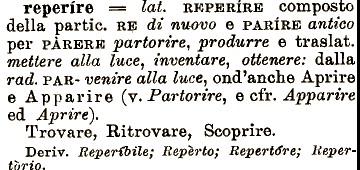RÈ di nuovo e PARÌRE antico per PARERE partorire^ reperire === lat. REPERIRE composto produrre e traslat. della parfcic. mettere alla luce, inventare, ottenere: dalla rad. PAR- venire alla luce, ond'anche Aprire e Apparire (v. Partorire, e cfr. Apparire ed Aprire). Trovare, Ritrovare, Scoprire. Deriv. Reperibile; Repèrto; Repertdre; Repertnrin.