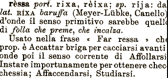 per cacciarsi avanti onde poi il senso corrente di Affollarsi rèssa pori. rixa, rèixa; sp, rija: da lai. RÌXA baruffa (Meyer-Lùbke, Canello) d'onde il senso primitivo sarebbe quelle di folla che preme^ che incalza. Usato Instare nella frase « Far ressa » ch prop. è Accattar briga importunamente per ottenere chec ohessia; Affaccendarsi, Studiarsi.