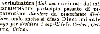 dividere da DISCRIMEN dimione, onde anche si disse Discriminale ago per dividere scriminatura \dial. sic. scrima[: dal laf. ISCRIMINĀTUS parfcicipio passato di -"DIURIMINĀRK i capelli (cfr. Cribro^ Criime. Crine}.