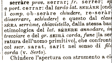 serrarne, chiavistello, dalla stessa bas etimologica del lat. SÈRERE annodare^ in trecciare e del gr. SEIRÀ cordai/une ]la ser ratura dell'uomo primitivo], che confront col sscr. sarai, sarit nel senso di file corda (v. Serto). Chiudere sp e pori. cerrar: dal tardo lai. SEPARÉ |ond i comp. oh-seràre chiudere^ re-seràr disserrare, schiuderei e questo dal clas^ SERA l'apertura serrare prov, serrar; fr. serrer; con strumento a cL