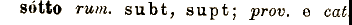 dietro^ lo che onde sscr. upa-mas (=== angsass. ufema, lat. sùmmusj altissimo; cfr. zend. upa, quello di superiorità, perocché il vero significato sia quello di presso, si attaglia tanto a ciò che sta sotto, che a quello che sta sopra: a.a.ted. oba, mod. ob, La s del latino corrisponde allo spirito iniziale, che è nel greco, come in sòmnus== gr. y p n o s Uprvod sonno (cfr. Sub). Preposizione got. uf sopra (v. Sub e Super). sotz;/r. sous; a. sp. 6 a. pori. solo: dal lai. SÙBTUS [e SÙBTER] da SUB |== gr. YPÒ| che confronta col sser. ÙPA, che oltre il senso d'inferiorità, ha pure che denota inferiorità di sito e talvolta di condiziono e di grado, ed è correlativo di Sopra. Deriv. Sottàno-a. Cfr. Supino.