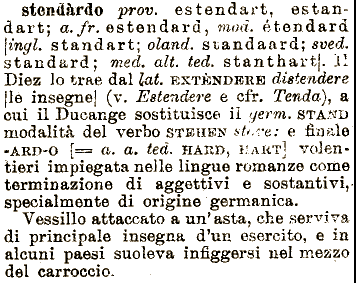 .servi" di principale insegna d'un esercito, e u alcuni paesi suoleva infiggersi nel mezz stendardo prov. estendart, estandart; a.fr. estendard, yerm. STA--':) modalità del verbo STKHSN .^^ •:-; 'i•' ••c -ARD-O [=== mod. étendard \ingl. standart; oland. standaard; sve'^ standard; med. alt. ted. stantharfcj. .i Diez lo trae dal lat. RXTÈNDBRE distendere [le insegne) (v. Estendere e cfr. Tenda), a cui il Ducange sostituisce il romanze come terminazione di aggettivi e sostantivi. specialmente di origine germanica. Vessillo attaccato a un^asta, che a. a. ted. HAIZD, HAK'.'J v.'J-.-u* tieri impiegata nelle lingue del carroccio.