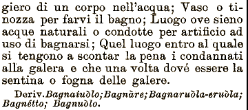 un corpo nelPacqua; Vaso o tinozza per si tengono a scontar la pena i condannati alla giero di farvi il bagno; Luogo ove sieno acque naturali o condotte per artifìcio ad uso di bagnarsi ; Quel luogo entro al quale galera e che una volta dovè essere la sentina o fogna delle galere. TQTÌv.Bagnaiublo;Bagnàre;Bagnarubla-erubla; Bagnétto; Bagnublo.