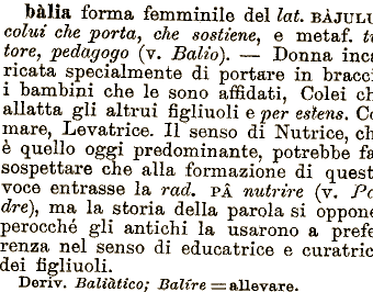 inei ricala specialmente di bālia forma femminile e per estens. che sostiene^ e metaf. t\ tore, pedagogo (v. Balio). Donna del lat. BĀJULI colui che porta, portare in brace; i bambini che le sono affidati, Colei ci allatta gli altrui figliuoli C mare, Levatrice. Il senso di Nutrice, ci č quello oggi predominante, potrebbe ff sospettare che alla formazione di quest voce entrasse la rad. PA nutrire (v. PC dre), ma la storia della parola si oppon perocché gli antichi la usarono a pref( renza nel senso di educatrice e curatric dei figliuoli. Deriv. Baliātico; BaUre = allevare.
