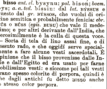 è he dagli antichi fu detto BTSSO anche e di ossuto rado, e che oggidì serve speciallente a fare alcune vesti sacerdotali, E pinione che il bisso provenisse dalle Inie e dal? Egitto ed era usato per farne obilissime bisso che erosimilmente è la culla di questa voce. - Sorta di tela di lino assai fine, vesti :, e siccome poi tali vesti cano spesso colorite di porpora, quindi ani. si. bysynu; poi, bison; boem, ys; a.a.ted, b i ss in: dal lat. BYSSUS e uesto dal gr. Byssos, che vuoisi di ori •ine semitica e probabilmente fenicia^ ébr. ùs o BÙSS (egiz. BUSU) che vale il medeimo; e per altri derivante dall'India, stesso col or porpora.