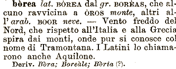 BOOR neve. — Včnto freddo de] Nord, che rispetto all'Italia e alla Grecia spira dai monti, onde pur si conosce co] nome di Tramontana. I Latini lo chiamarono anche Aquilone. Deriv. Bora; Boreale; Bbria bňrea lai. BŇREA dal gr. BOBČAS,che alcuno ravvicina a ŇROS monte, altri alV arab. (?).