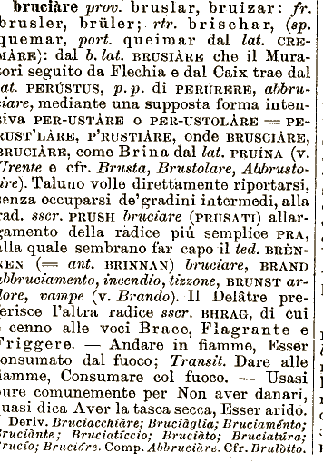 e dal Caix trae dal a.t. PERÙSTUS, 1 ne mar, pori queimar dal lat. CREMARE): dal 5. lai. BRUSIÀRE che il Muraiori seguito da Flechia p-p- di PERÙRERE, abbruciare, BRAND ibbritciamento, incendio, tizzone, BRUNST arlore, vampe (v. Brando), II Delàtre preérisce l'altra radice sscr. BHRAG, di cui i cenno alle voci Brace, Flagrante e Friggere. — Andare in fiamme, Esser onsumato dal la tasca secca, Esser arido. Deriv. Bruciacchiare; Bruciàglia; mediante una supposta forma intontiva PER-USTÀRE O PER-USTOLÀRE === PEUJST'LÀRE, P'RUSTIÀRE, Onde BRUSCIÀRE, ÌRUCIÀRE, come Brina dal lat. PRUINA (v. 7rente e cfr. Brusta, Brustolare, AbJbrustoire). Taluno volle direttamente riportarsi, lenza occuparsi de1 gradini intermedi, alla •ad. sscr. PRUSH bruciare (PRUSATI) allargamento della fuoco; Transit. Dare alle [amme, Consumare col fuoco. — Usasi ure comunemente per -Non r, b r u i z a r : fr. brusler, brùler; rfr. brischar, (sp. aver danari, uasi dica Aver bruciare prov. b r u s 1 a radice più semplice PRA, blla quale sembrano far capo il ted. BRÈN^EN (== ant. BRINNAN) bruciare, Bruciaménto; bruciante; Bruciatìccio; Bruciato; Bruciatura; 'ruczo; Bruciare. Comp. Abbruciare. Cfr. Brulotto.