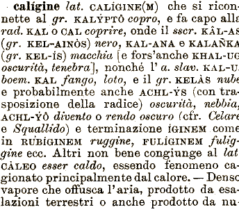 e prohabilmente anche ACHL-YS (con trasposizione della radice) oscurità, FULIGINEM fuliggine ecc. Altri non bene congiunge al lat CÀLEO esser caldo, essendo fenomeno cagionato principalmente dal calore. — Dense vapore che offusca l'aria, prodotto da esalazioni nebbia ACHL-YÒ divento o rendo oscuro fcfr. Celart e Squallido) e terminazione IGINEM KAL fango, caligine come in RU'BIGINEM ruggine, lat. CALIGINE(M) che si ricon nette al gr. KALYPTÒ copro, e fa capo alL rad. KAL o CAL coprire, onde il sscr. KAL-A^ (gr. KEL-AINÒS) nero, KAL-ANA e KALANKA (gr. KEL-is) macchia [e fors'anche KHAL-UC oscurità, tenebra]^ nonché 1' a. slav. KAL-TJ boem. loto, e il gr. KBLÀS nutn terrestri o anche prodotto da nu