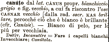 brillante' (cfr. Canizie). grigio e fig. vecchio, a cui fa riscontro l'o^c caėiųfo dal lat. CĀNUS propr. bianchiccio CĀSNAR vecchio [dalla rad.sscr. KAS brillare, perocché ciō che č bianco č Bianco di pelo, per le pių per vecchiaia. Deriv. Incanutire == Fare i capelli bianchi Invecchiare; Canutola.