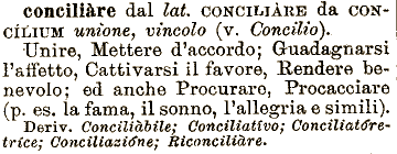 da CONCILIUM unione, vincolo (v. Concilio). -Unire, Mettere d^accordo; Guadagnarsi Panetto, Cattivarsi il favore, Rendere benevolo ; ed anche Procurare, Procacciare (p. CONCILIARE es. la fama, il sonno, P allegria e simili). Deriv. Conciliàbile; Conciliativo; Conciliatoretrice; conciliare dal lat. Conciliazione; Riconciliare.