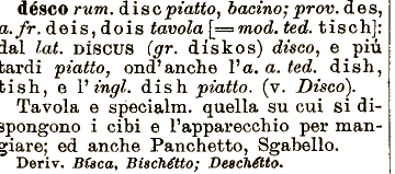 piatto, bacino; prov. des, a.fr. deis, dois tavola [===wod. ted. tisch]: ial lai. DISCUS i cibi e Papparecchio per mangiare; ed anche Panchetto, Sgabello. Deriv. Bfaca, Biscotto; Deschétto. désco rum. dis e (gr. diskos) disco, e più bardi piatto, ond'anche Va. a. ted. dish, bish, e P ingl. dish piatto, (v. Disco). Tavola e specialm. quella su cui si dispongono