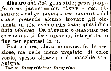 alcuno trovare gli elementi in IŌN viola e PAN tutto; quasi dica tutta violacea. Da IĀSPIDE o GIASPIDE per corruzione si fece DIASPRO, interposta in fine per epentesi la R. Pietra dura, che verde, spesso chiazzata di macchie sanguigne. Deriv. Diaspriflcāre; diaspro ant. ital. giaspide; prov. jaspi, fr. e sp. jaspe: ==== lai. JĀSPIS " acc. JĀSPIDEM - dal gr. IASPIS - acc. IASPIDA - del quale pretende si annovera fra le preziose, ma delle meno pregiate, di color Diasprzno.