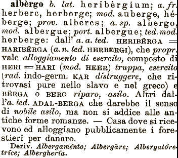 asilo. Altri dalVa. ted. ADAL-BERGA che darebbe il senso di nobile asilo, albèrgo b. lai. heribèrgium; a. fr herberc, herberge; mod. auberge, héberge; prov. albercs; a. sp. albergo. mod. albergue: pori. a 1 b e r g u e ; ted. mod. herberge: dall' a. a. ted. HERIBÉRGA == HARIBÈR&A (a.n. ted. HERBERGri), che propr. vale alloggiamento di esercito, composto di HERI === HARI (mod. HEER) truppa, esercito [rad. indo-germ. ma non si addice alle antiche forme romanze. KAR distruggere, che ritrovasi — Casa dove si ricevono ed alloggiano pubblicamente i forestieri per danaro. Deriv. AVbergaménto; Albergare; Albergatóretrice; Albergheria. pure nello slavo e nel greco) e BÉR&A o BERGr riparo,