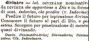 == lai. DIVINARE nominative da DIVÌNUS che appartiene a Dio e in forme di sost. indovino, che predice (v. Indovino) per ispirazione divina divinare Predire il futuro Conoscere il futuro al pari di Dio, e per estens. Scorgere per penetrazione di mente quasi divinando. Deriv. Divinatore-trice; Divinatorio; Divina sióne. Cfr. Indovinare.