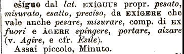 spingere, esiguo dal lai EXI&UUS propr. pesato, misurato, esatto, preciso, da EXÌGEBE che vale anche pesare, misurare, comp. di EX fuori e ÀGrERE portare, alzare (v. Agire, e cfr. Esile). Assai piccolo, Minuto.