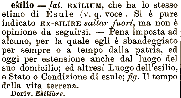 luogo del suo domicilio; ed altresì Luogo dell'esilio, e Stato o Condizione di esule; fig. Il tempo che ha lo stesso etimo di Esule (v. q. voce . Si è pure indicato EX-SILIRE saltar fuori, ma non è opinione da seguirsi. — Pena imposta esilio === lat. EXÌLIUM, ad alcuno, per la quale egli è sbandeggiato per sempre o a tempo dalla patria, ed oggi per estensione anche dal della vita terrena. Deriv. Esiliare.