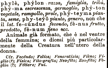 il lai. fe-cùnd'as fecondo, fè-nus frutto, prodotto, fé-mi m fieno èpe. Animale già formato, Fieno; Figlio (?); Fisica; Fito-grafia; Neo-fito; Zoo-fito; phylè, phylonVmsza, famiglia, tribù, phy-ma escrescenza, germoglio, phy-ton vegetale, rampollo.pròle, phy^tey m a pianta, seme, phy-tey 6 pianto, genero, non che òhe è nel ventre della femmina; e dicesi più particolarmente della Creatura nell'utero della donna. Cfr. Fecondo; Felice; Feneratizio; Foglia (?); Fottere; Fui.
