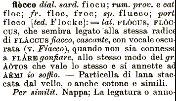 clie sembra legato [ed.Plocke]:==?a.rLÒcus, flòcco dial. sard. fiocu; rum. prov. e cai floc; /r. floc, froc; sp. flueco; pori fleco FLOC cus, alla stessa radic di FLÀCCUS fiacco, cascante f con vocale oscu rata (v. Fiacco\ quando non sia conness a FLÀRE gonfiare^ allo stesso modo del gr ÀÒTOS che vale lo stesso e si annette ac ÀÈMI io soffio. -— Particella di lana stac cala dal vello. o anche cotone e simili. Per similit. Nappa; La legatura o anno