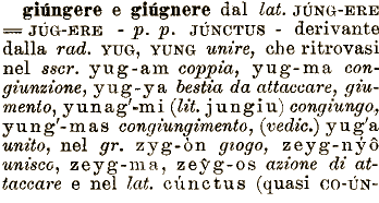 Giogo). Propr. Unire due cose in modo che p. p. Giunto; Giunta; Giuntare; Giuntura; Giunzióne '== Congiungimento. Comp. Aggiungere; Oongiungere; Disgiungere; Ingiungere; Soggiungere; Soggiungere; Sopraggiungere. ad esso, si da poterlo toccare: allo stesso modo che Partire, includendo la idea del distacco, si disse nella barbara latinitą « separare ». Deriv. Giungiménto, Cfr. Biga; Coniugare; Coniugo; Giogo; Giugulare; Giumento; Giunco; Giure; Giusto; Zeugima; C-TUS, CON-IŁNC-TUS) tutto e propr. unito \ insieme^ congregato (cfr. si tocchino; ma si usa nel senso di Arrivare ad un luogo determinato, quasi dica Avvicinarsi