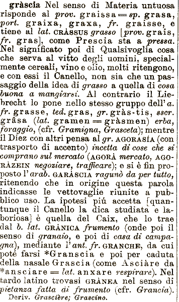 da ^ansciare == lat. anxare respirare). Nel tardo latino trovasi GRĀNEA nel senso di pietanza fatta di frumento (cfr. idea di grasso a quella di cosa buona a mangiarsi. Al contrario a pubblico uso. La ipotesi pių accetta [quantunque il Canello la dica studiata e laboriosa] sta a pressa. Nel significato poi di Qualsivoglia cosa che serva al vitto degli uomini, specialmente cereali, vino e olio, nello stesso gruppo dell' a. fr. grasse, ec?.gras, ^r. grās-tis, sscr. grāsa {lat. gramen === grāsmen) erba, foraggio^ (cfr. Gramigna, Grasceta)', mentre il Diez con altri pensa al gr. AGORASIA (con trasporto di accento) incetta di cose che si comprano sul mercato (AGORĀ sia che un passaggio della (come Asciare molti ritengono, e con essi il Canello, non č quella del Caix, che lo trae dal b. lat. CRĀNICA frumento (onde poi il senso di granaio, e poi di casa di campagna), mediante P ani. fr. GRANCHÉ, da cui potč farsi ^G-ranscia e poi per caduta della nasale Grascia Materia untuosa risponde al prov, graissa==Ŧp. grasa, port. graixa, graxa, fr. graisse, e tiene al lai. CRĀSSUS grasso |J)ro'u.grais, fr. gras], come Prescia il Liehrecht lo pone mercato, AGORĀZEIN negoziare, trafficare)', e si č fin proposto V arab. &ARĀSCIA ragunō da per tutto, ritenendo che in origine questa parola indicasse le vettovaglie riunite Grancid). grāscia Nel senso di Deriv. Grascičre; Gr ascino.