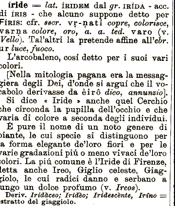 pagana specie si distinguono per a forma era la messaggera degli Dei, d'onde si argui che il vocabolo derivasse da è ir o dico, annunzio]. Si dice « Iride » anche quel Cerchio ;he circonda la pupilla dell'occhio e che yaria di varo (v. Vello). Tal'altri la pretende affine all'eér. izr luce, fuoco. I/arcobaleno, cosi detto per i suoi vari colori. [Nella mitologia colore a seconda degli individui. È pure il nome di un noto genere fiori e per le T'ari e gradazioni più o meno vivaci de'loro colori. La più comune è l'Iride di Firenze, letta anche Ireo, Giglio celeste, G-iag^iolo, le cui radici danno e serbano elegante decloro di nanfe, le cui iride === lai. IRIDBM dal gr. IRIDA - acc. ài ÌRIS - che alcuno suppone dettò per FIRIS: cfr. 88cr. vr-nati copre, colorisce, va ma colore, oro, a. a. ted. a ungo un dolce profumo (v. Ireos). Deriv. Iridàceo; Irid'èo; Irideseènte, Irzno •• atratto del giaggiolo.