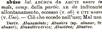 eccesso (v. ai)) e ÙTI usavi (v. Uso). — Ciò che eccede abuso lat. ABÙSLTS da ABÙTI usare in male, comp. della partic. AB da indicante allontanamento, nell'uso; Mal uso, Deriv. Abusaicnénto ; Abusare (sp. abusar, fr, abuser), Abusat6re-trice; Abusióne; Abusivo.