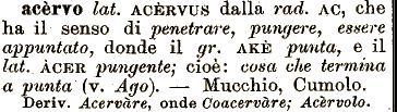 di penetrare, pungere, essere appuntato, donde il gr. AKÉ punta, e il lat. ÀCER pungente; cioè: cosa die termina a punta (v. Ago). — Mucchio, Cumolo. Deriv. Acervàre, onde Coacervare: acèrvo lat. ACÈRVUS dalla rad. AC, che ha il senso Acèrvolo.