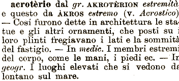 le sta tue e gli altri ornamenti, che posti su loro plinti fregiavano i lati e la sommiti del fastigio. d lontano acrotèrio dal gr. AKROTÈRIQN estremità e questo da ÀKROS estremo (v. Acrostico] — Cosi furono dette in architettura — In medie. I mèmbri estrem del corpo, come le mani, i piedi ec. —li geogr. I luoghi elevati che si vedono sul mare.