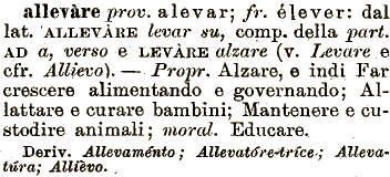 da] lat. ALLEVARE levar su, comp. della part, AD a, verso e LEVARE alzare (v. Levare e cfr. Allievo}. ; Allevatore-^trzce ; allevare prov. a levar; fr. élever: — Propr. Alzare, e indi Far crescere alimentando e governando; Allattare e curare bambini; Mantenere e custodire animali ; moral. Educare. Deriv. Allevaménto Alleva' tura; Allievo.