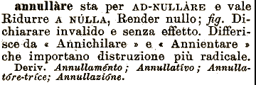 da « Annichilare » e « Annientare » che importano distrazione pił radicale. Deriv. Annullamento ; Annullativo annullare sta per AD-NULLĄRE e vale Ridarre A NULLA, Render nullo; fig. Dichiarare invalido e senza enetto. Differisce ; Annullato re-tnce; Annullar ione.