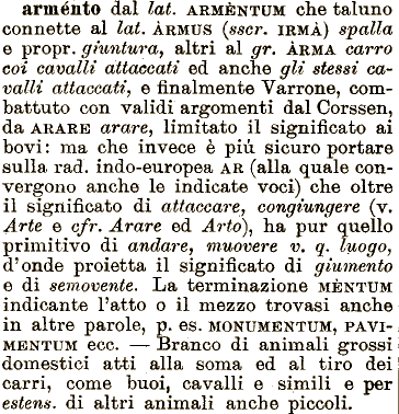 dal Corssen, da ARARE arare, limitato il significato quale convergono anche le indicate voci) che oltre il significato ai bovi : ma che invece è più sicuro portare sulla rad. indo-europea AR (alla atti alla soma ed al tiro dei carri, come buoi, cavalli e simili e per altri al gr. ARMA carro coi cavalli attaccati ed arménto dal lat. ARMÈNTUM che taluno connette al lai. ÀRMUS (sscr. IRMÀ) spalla e propr. giuntura, anche gli stessi cavalli attaccati, e finalmente Varrone, combattuto con validi argomenti di attaccare^ congiungere (v. Arte e c/r. Arare ed Arto), ha pur quello primitivo di andare, muovere v. q. luogo, d'onde proietta il significato di giumento e di semovente. La terminazione MÈNTUM indicante Patto o il mezzo trovasi anche in altre parole, p. es. MONUMENTUM, PAVIMENTUM ecc. — Branco di animali grossi domestici estens. di altri animali anche piccoli.