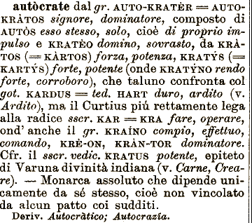 forza, potenza, KRATYS (==== KARTYs) forte, potente (onde KRATYNO rendo signore, forte, corroboro), che taluno confronta col gol. KARDUS ==== ted. HART duro, ardito (v. Ardito), ma il Curtius più rettamente lega alla radice Ofr. il sscr. vedic. KRATUS potente, epiteto di Yaruna divinità autòcrate dal gr. AUTO-KRATÈR == AUTOKRÀTOS sscr, KAR === KRA fare, operare, ond5 anche il gr. KRAÌNO compio, effettuo, comando, KRÈ-ON, KRÀN-TOR dominatore. indiana (v. Carne, Creare). — Monarca assoluto che dipende unicamente da sé stesso, cioè non vincolato da alcun patto coi dominatore, composto di AUTÒS esso stesso, solo, cioè di proprio impulso e KRATÈO domino, sovrasto, da KRÀTOS (== KÀRTOS) sudditi. Deriv. Autocràtico; Autocrazia.