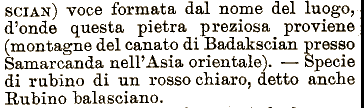 di Badakscian presso Samarcanda nell'Asia orientale). — Specie di rubino di un rosso chiaro, detto anche Rubino baia SCIAN) voce formata dal nome del luogo, d'onde questa pietra preziosa proviene (montagne del canato sciano.