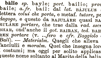 quasi BA RULĀRE portare, che trae dalla rad. ssc7 3HAR, ond'anche il got. BAIRAN, ted. BAE REN portare (v. .../ero e cfr. Baggiolo Bali). Materialm. Quegli che alleva ^nciulli bālio sp. bay le; port. baiilo; proi baile; a.fr. baii: dal lat* da BAJULĀRE BĀJTJLUS lettera colui che porta, e metaf. tutore, pe iagogo, e questo e moralm. Quei che insegna lor . costumi; ma oggi per solito applicas mesto nome soltanto al Marito della balia