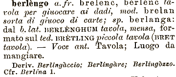 Deriv. Berlingaccio^ Berlingare, berlčua^o a.f'r. brelenc, berlenc tavola per gmocare ai dadi, mod. hrelan sorta di giuoco di tavola). — Voce ani. Tavola; Luogo da mangiare. carte; sp. berlanga: dal b. lai. P»ERLČNGHUM tavola, mensa, formato sul ted. BRČTLlxa piccola tavola (BRET Berlingbaso. Cfr. Berlina 1.