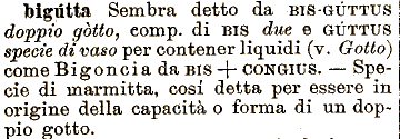 Gotto) come Bigoncia da BIS 4~ CON&IUS. Specie di marmitta, "bigutta Sembra detto da BIS-GŁTTUS doppio gņtto, eomp. di BIS due e GŁTTUS specie di vaso per contener liquidi (v. cosi detta per essere in origine della capacitą o forma di un doppio ^otto.