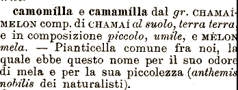 fra noi, \i quale ebbe questo nome per il suo odor( camomilla e camamilla dal gr. CHAMAI MELON comp. di CHAMAI al suolo, terra terra e in composizione piccolo^ zimile, e MÈLOI^ mela. — Pianticella comune di mela e per la sua piccolezza {anthemii nobilis dei naturalisti).