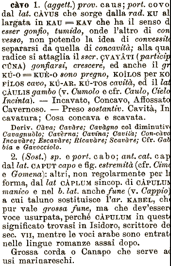 voce usurpata, perché CĀPTTLXJM in quest signincato ecfr. Caulo, Cielo Incinta). Incavato, Concavo, Affossato Cavernoso. Preso sostantiv. Cavitā, In cavatura; d esser gonfio, tumido, onde trovasi in Isidoro, scrittore pori. covo dal lai. CĀVUS che sorge dalla rad, KU al largata in KAU === KAV che ha il senso per KO FĖLOS cavo, KŲ-AR, KŲ-TOS cavitā, ed il lai CĀULIS gambo (v. Cumolo Paltro di con vesso, non potendo la idea di convessi^ separarsi da quella di concavitā; alla qua radice de sec. vii, mentre cavo 1. (aggetta prov. caus; Cosa concava e scavata. Deriv.Cava; Cavare; Oavāf^no col diminativ Cavagnu^ėo; Cavčrna; Cavzna; Cavita; Con-cāvo Incavare; Escavare; Ricavare; Scavare; Cfr. Oab bia e Gavocciolo. 2. {Sost,) sp. e pori. cabo; ani. cai. cap dal lai. CAPUT capo e fig. estremitā (cfr. Cimi e Gomena): altri, non regolarmente per L forma, dal lai^ CĀPLUM sincop.di cĀPULm manico e nel &. lai. anche fune (v. Cappio] a cui taluno sostituisce Par. KABEL, ch pur vale grossa fune, ma che dev^esser si attaglia il sscr. CVAYĀTI (partici? CUNA) gonfiarsi, crescere, ed anche il gr KTJ-O ^ KUČ-o sono pregno, KOĖLOS le voci arabe sono entrai nelle lingue romanze assai dopo. Crossa corda o Canapo che serve a usi marinareschi.