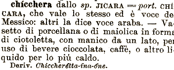 per lò più caldo. uso di bevere cioccolata, chicchera dallo sp. JICARA=== pori. cui CARA, che vale lo stesso ed è voce de Messico: altri la dice voce araba. — Vasetto di porcellana o di maiolica in fbrms di ci otoletta, con manico da un lato, pe] caffè, o altro li quido Deriv. C7iicc7ier^tta-ina-fne.