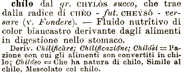 in digestione nello stomaco. Deriv. CUilifìcàre; QhiUficaaiffne; Ohilosi== Fazione con. cui gli Chioso e= Che ha natura di chilo, Simile chilo dal gr. CHYLÒS succo, che trae dalla radice di CHÈO - fui. CHEYSÒ - versare (v. Fondere). — Fluido nutritivo di color biancastro derivante dagli alimenti alimenti son convertiti in chilo; al