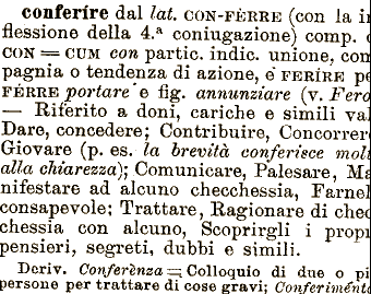 pensieri, segreti, dubbi e simili. Dcriv. Conferenza == Colloquio di due o pi persone per trattare conferire dal lat, CON-FÈRRE (con la ii flessione della 4^ coniugazione) comp. CON === CUM con partic. indie, unione, con pagnia o tendenza di azione, e FERIRE p( FÉRRB portare ' e ng. annunziare Biferito a doni, cariche e simili va] (v. Fero — moli alla chiarezza)', Comunicare, Palesare, ME nifestare ad alcuno checchessia, Farne! consapevole: Trattare, Kagionare di che chessia con alcuno, Scoprirgli i propi Dare, concedere; Contribuire, Concorrer Giovare (p. es. la brevità conferisce di cose gravi; Conferimenti