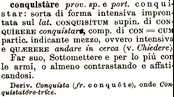 andare m cèrea (v. Chiedere} Far sao, conquistare prov. sp. e pori. con qui star: sorta di forma intensiva impron mezzo, ovvero intensivi e QU^BRERE tata sul Za. CONQUISÌTUM supin. di CON QUIRERE conquistane comp. di CON == cm partic. indicante Sottomettere e per lo più coi le armi, o almeno contrastando e affati candosi. Deriv. Conquista {fr^ e o n q a è t e), onde Con quistatdte-trfce.